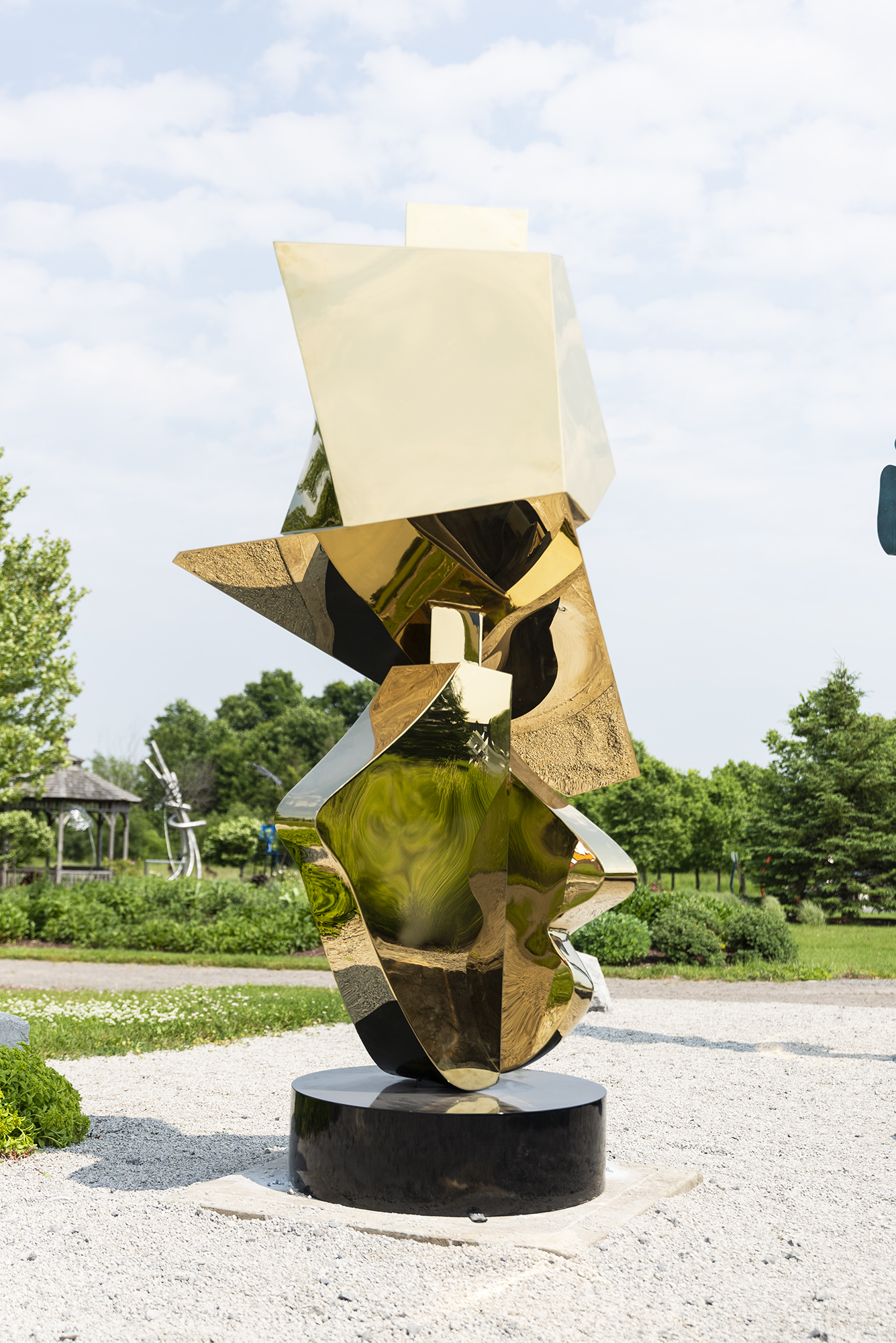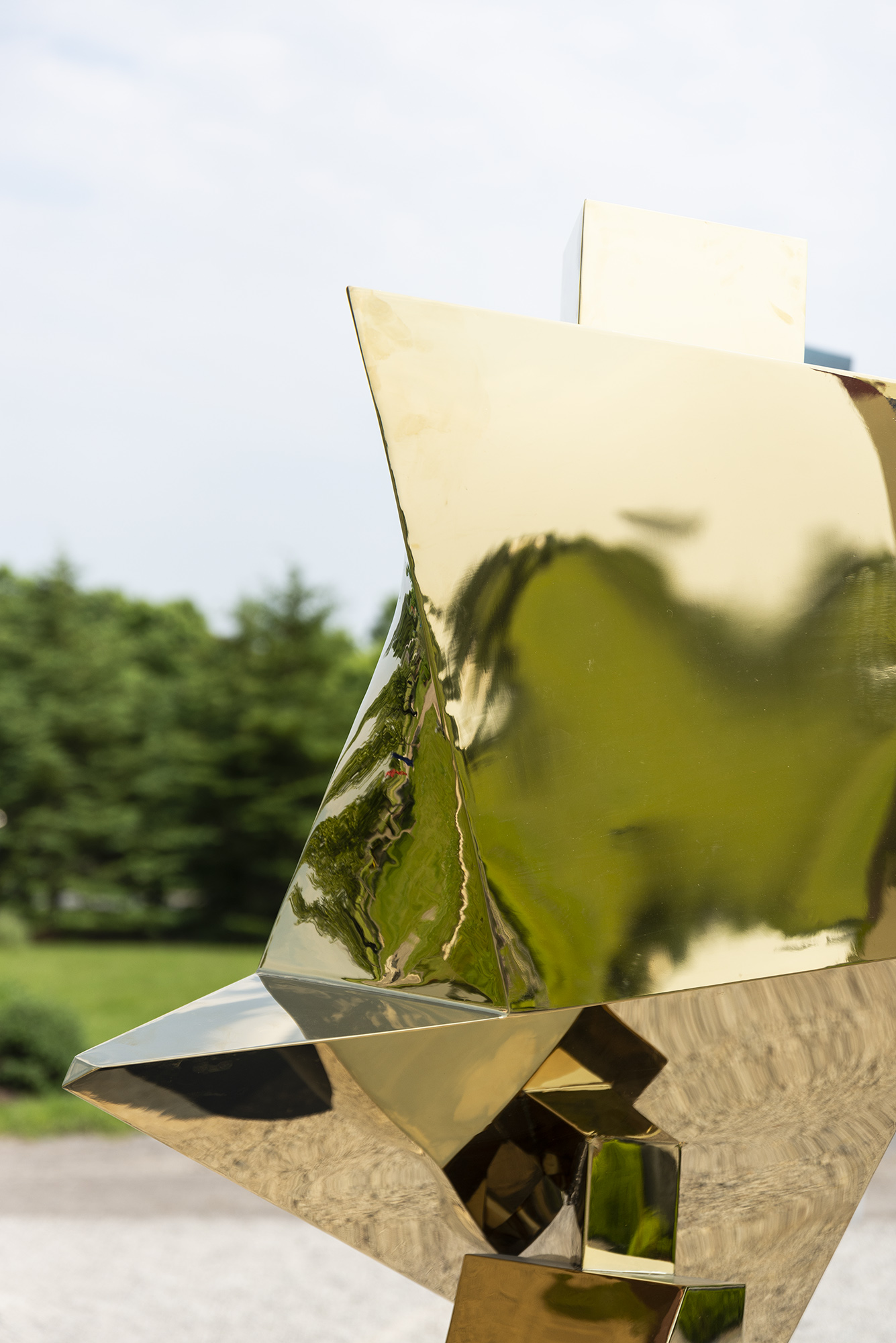 This contemporary abstract sculpture was created from stainless steel and painted gold.This impressive monumental sculpture by Viktor Mitic was forged from stainless steel and painted with 24K gold. Highly regarded for his unique visual style, the Canadian artist favours abstract form. Halcyon exhibits Mitic’s signature flowing lines and imaginative shape. It's highly polished, bright gold surface naturally reflects light. The name ‘halcyon’ refers to the Greek myth that Zeus calmed the winds during the winter solstice so a kingfisher (Alcyone, the former daughter of the god of wind) could lay her eggs. The term ‘Halcyon days’ has become synonymous with a period of calm and peace.