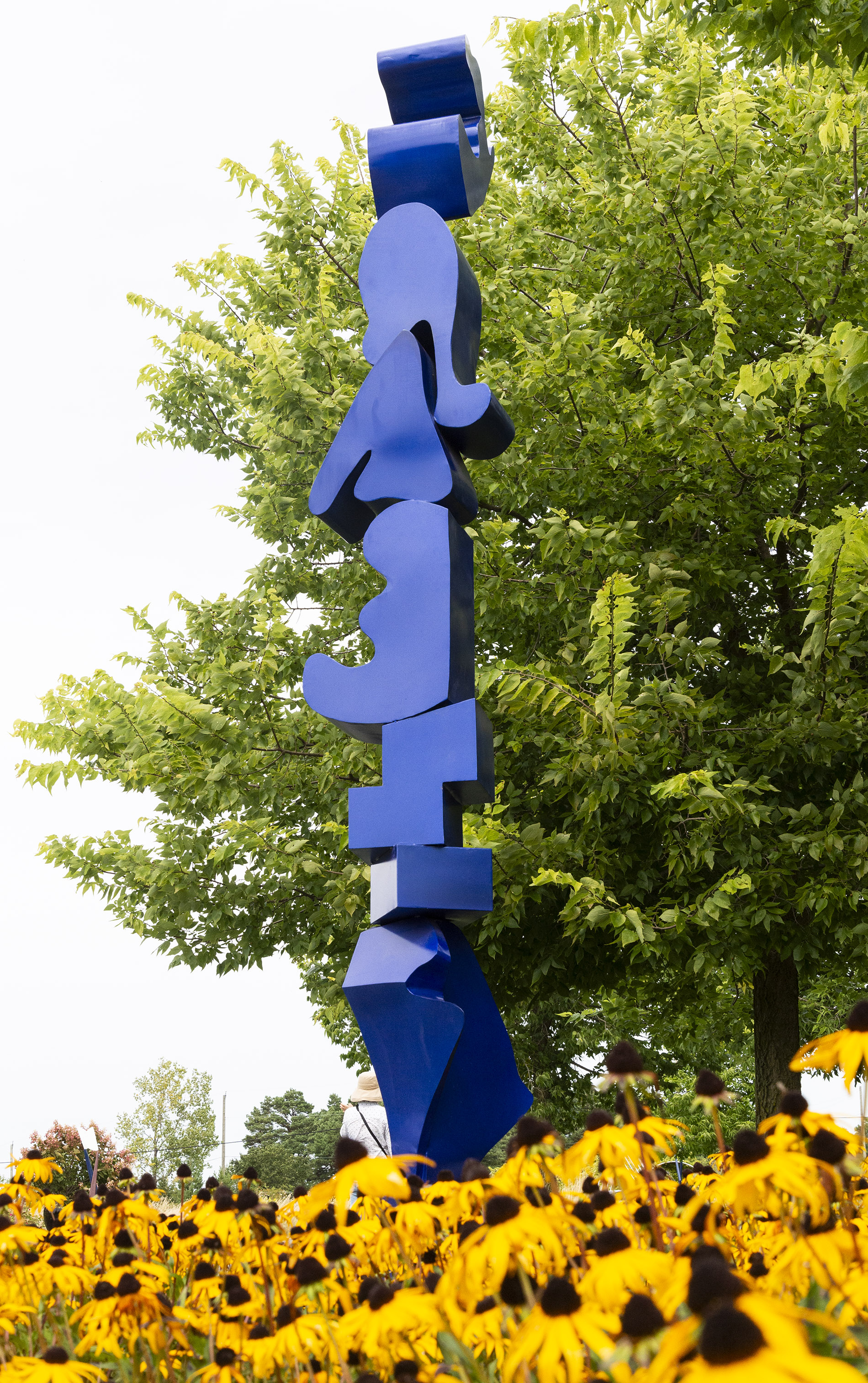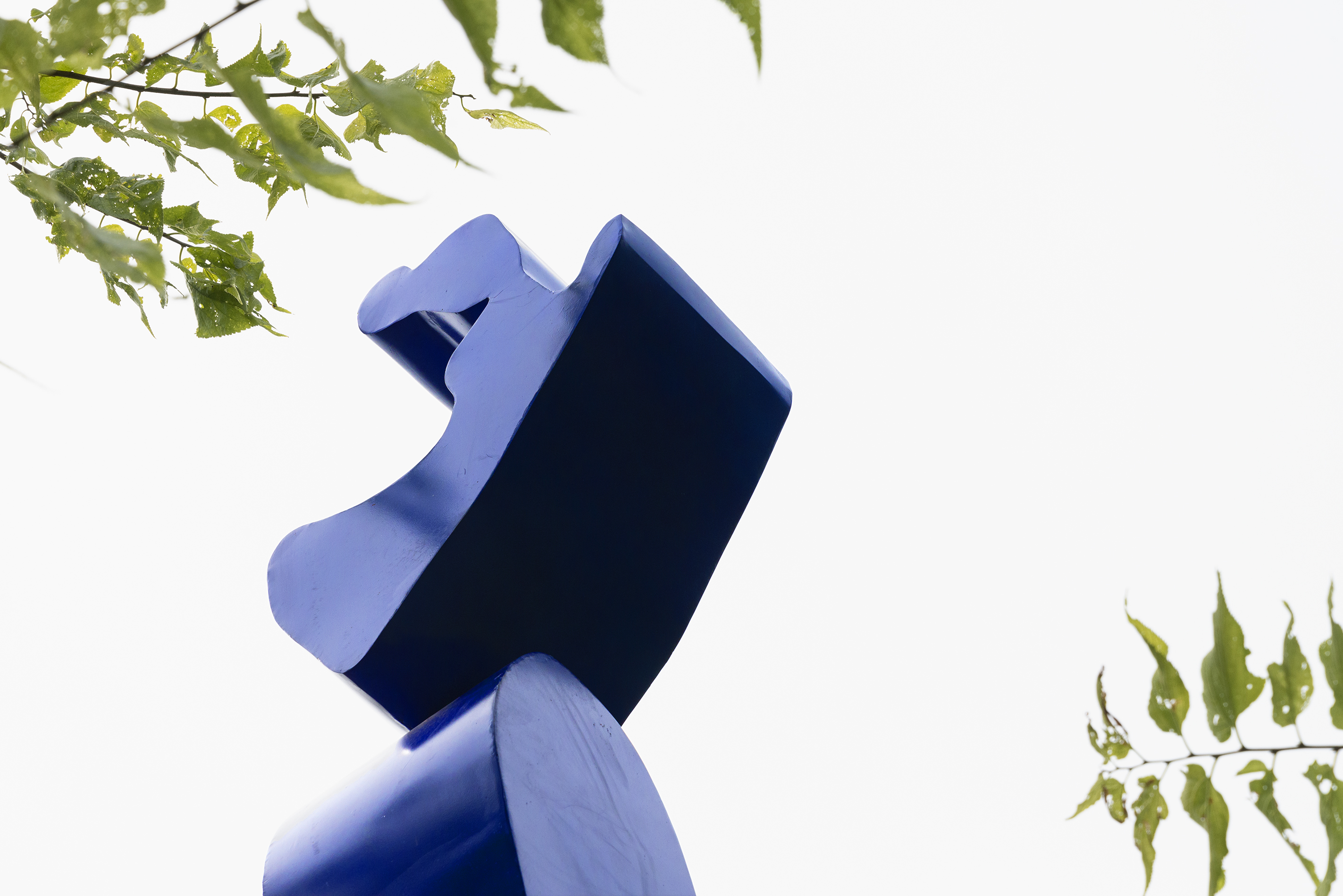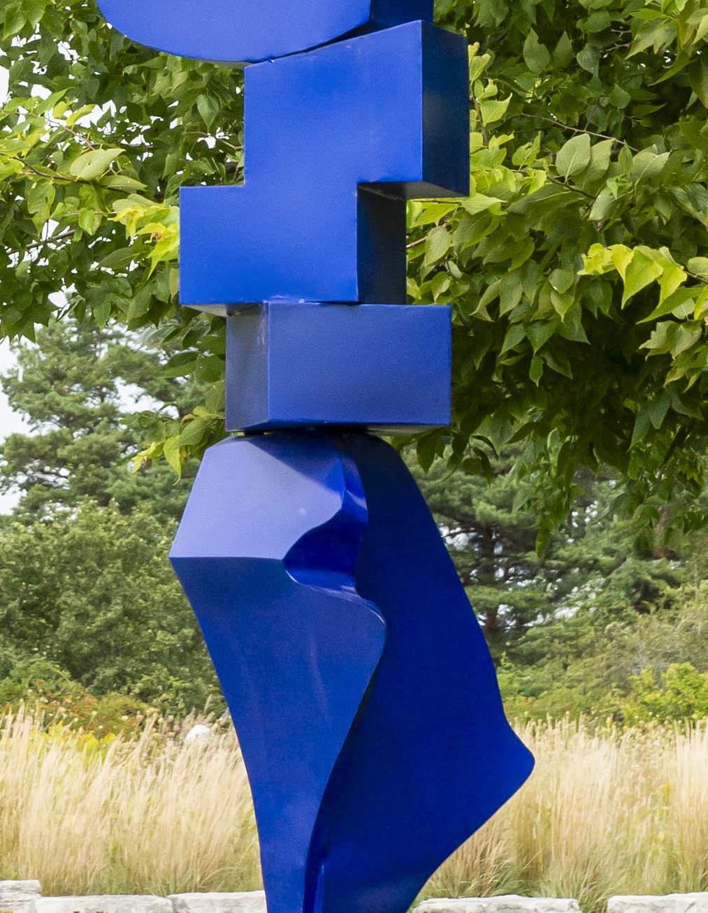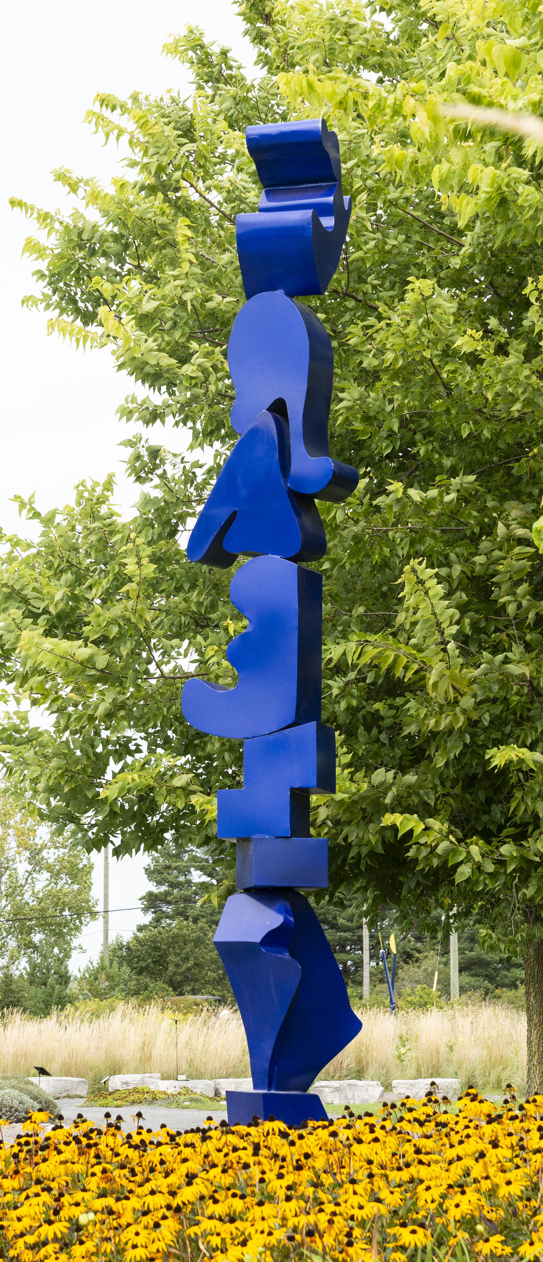 Formidable and eye-catching, this outdoor sculpture is by Viktor Mitic known for his provocative contemporary artwork. This is one of a series of abstract ‘tower-like’ sculptures—each piece hand-forged in stainless steel and painted a shiny deep blue. The form is imaginative and playful; the result of the artist’s ability to envision what paint drippings from his studio floor would look like as sculptural objects. The colour is a bold choice—a signature of Mitic’s unique work.“My goal with these is to showcase the universal human connection we are all a part of, and if I can make a statement while doing so, even better.” Viktor Mitic