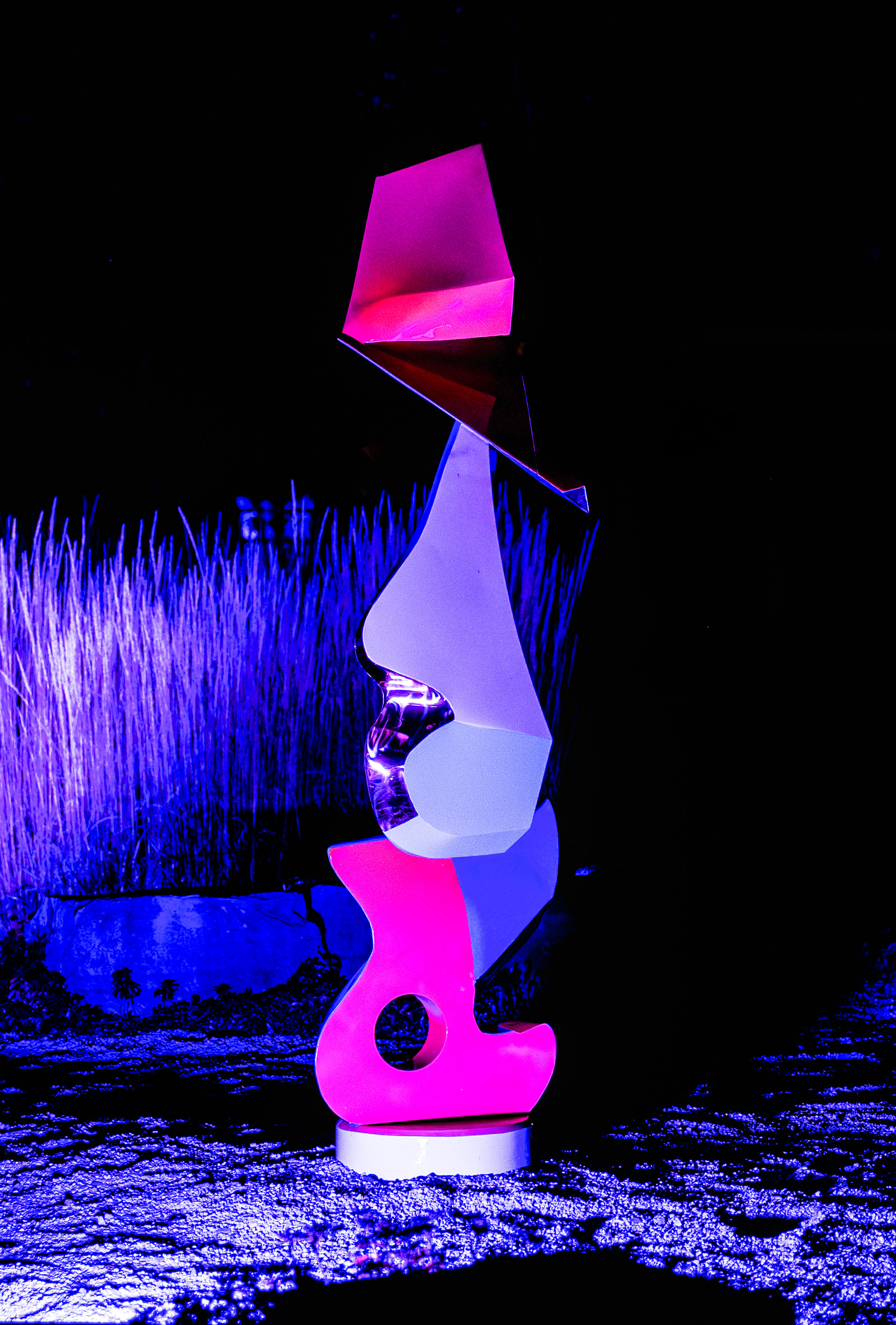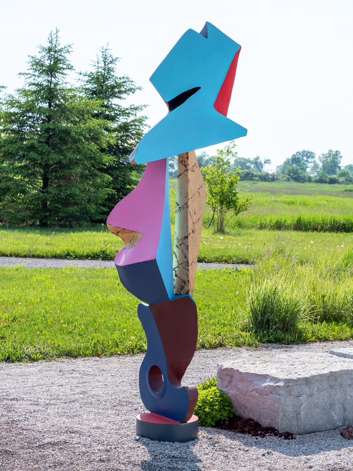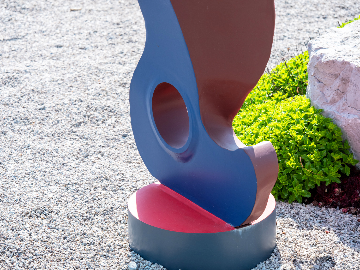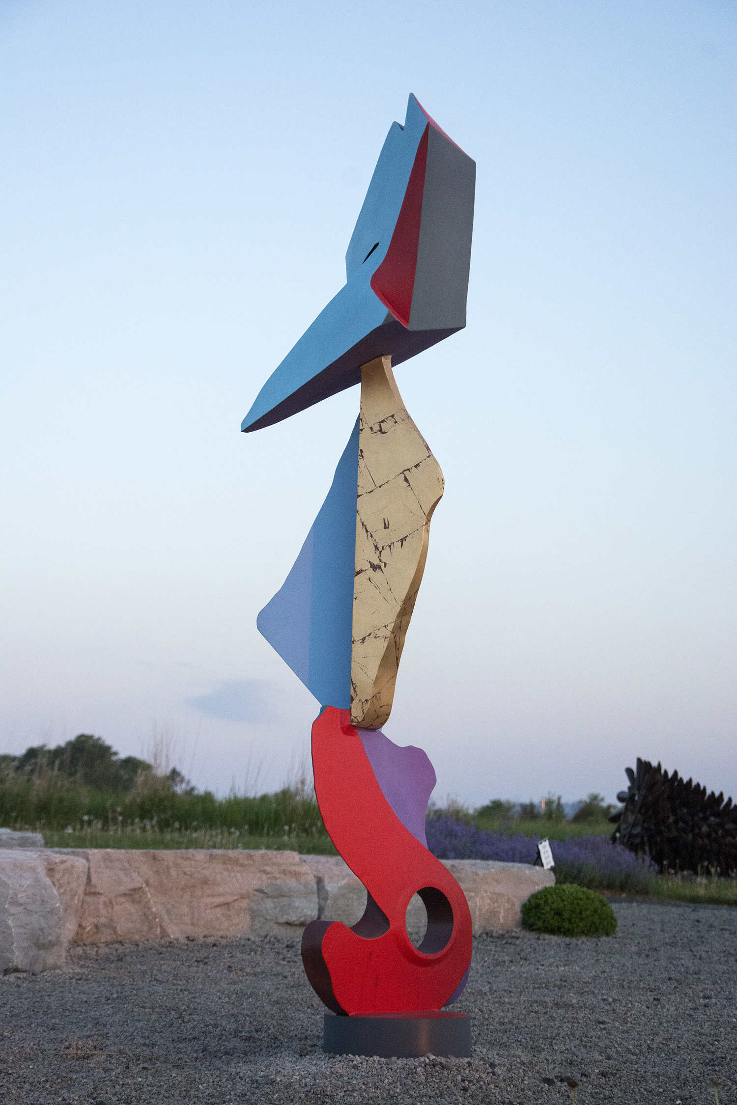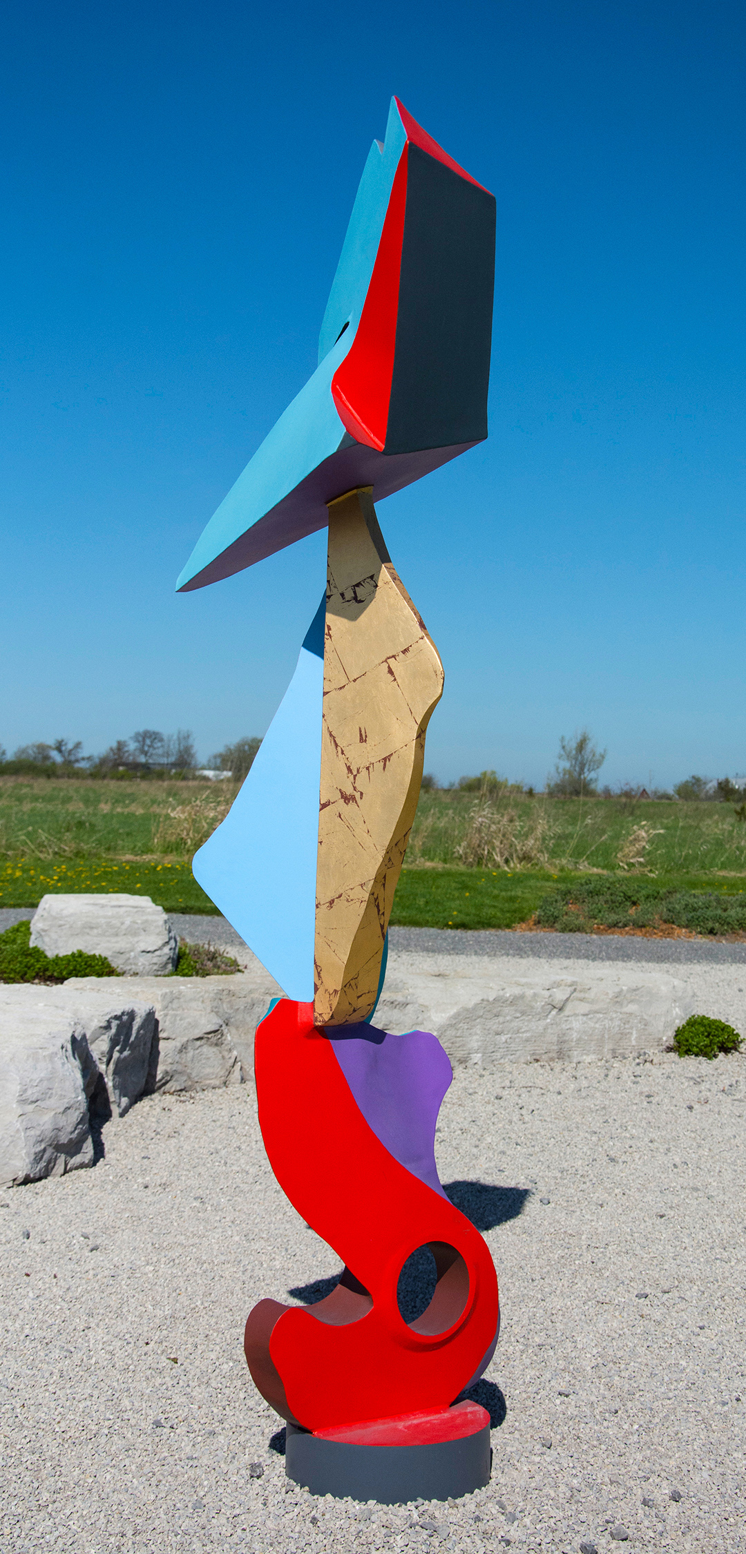 Gold plated stainless steel outdoor sculpture. Abstract shapes in glossy red, orange, violet and blue with highlights of gold form a playful column in this outdoor sculpture by Viktor Mitic. Mitic’s sculptures were inspired by the patterns of colourful paint drippings he noticed on his studio floor.“My goal with these is to showcase the universal human connection we are all a part of and if I can make a statement while doing so, even better.” Viktor Mitic