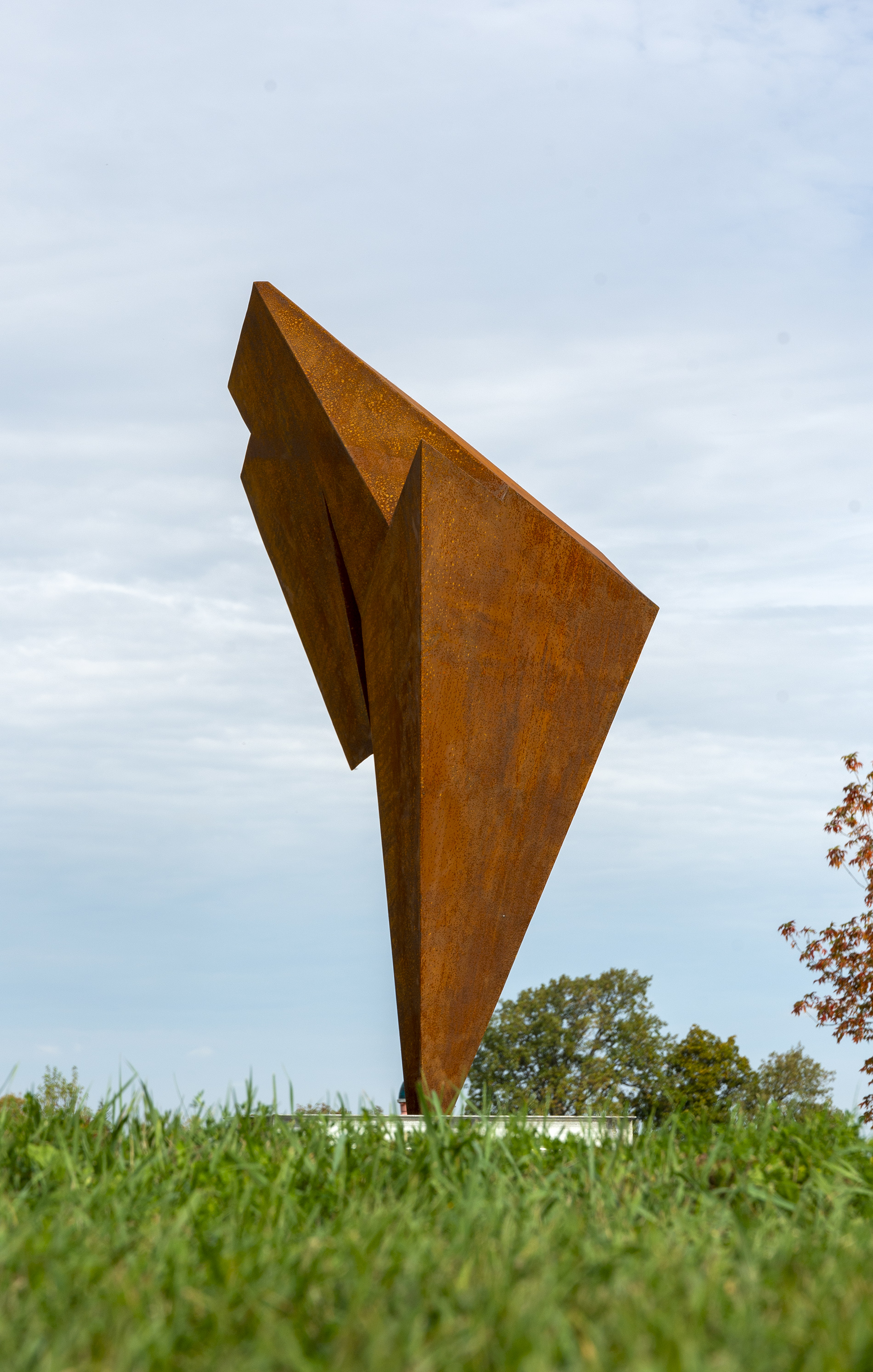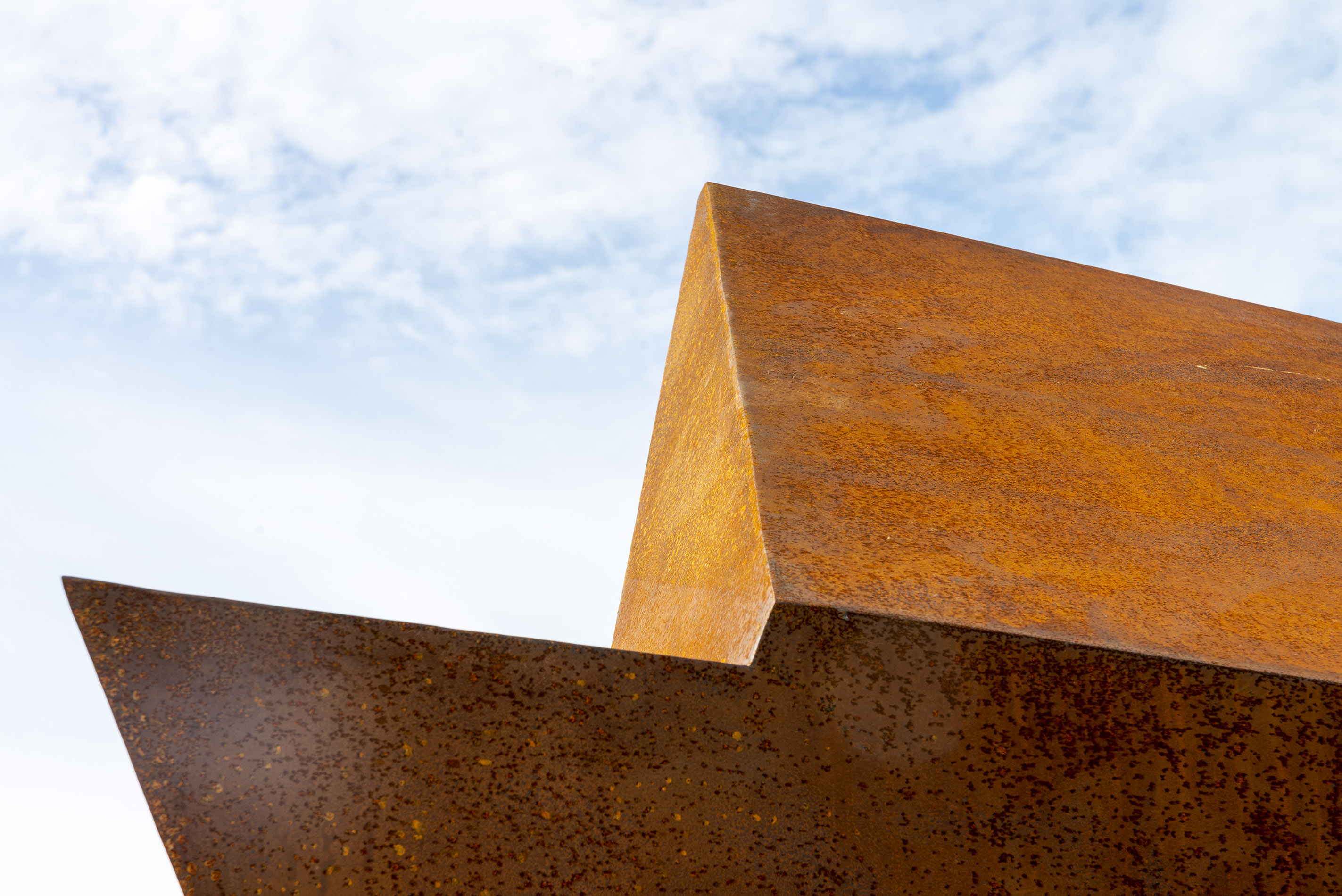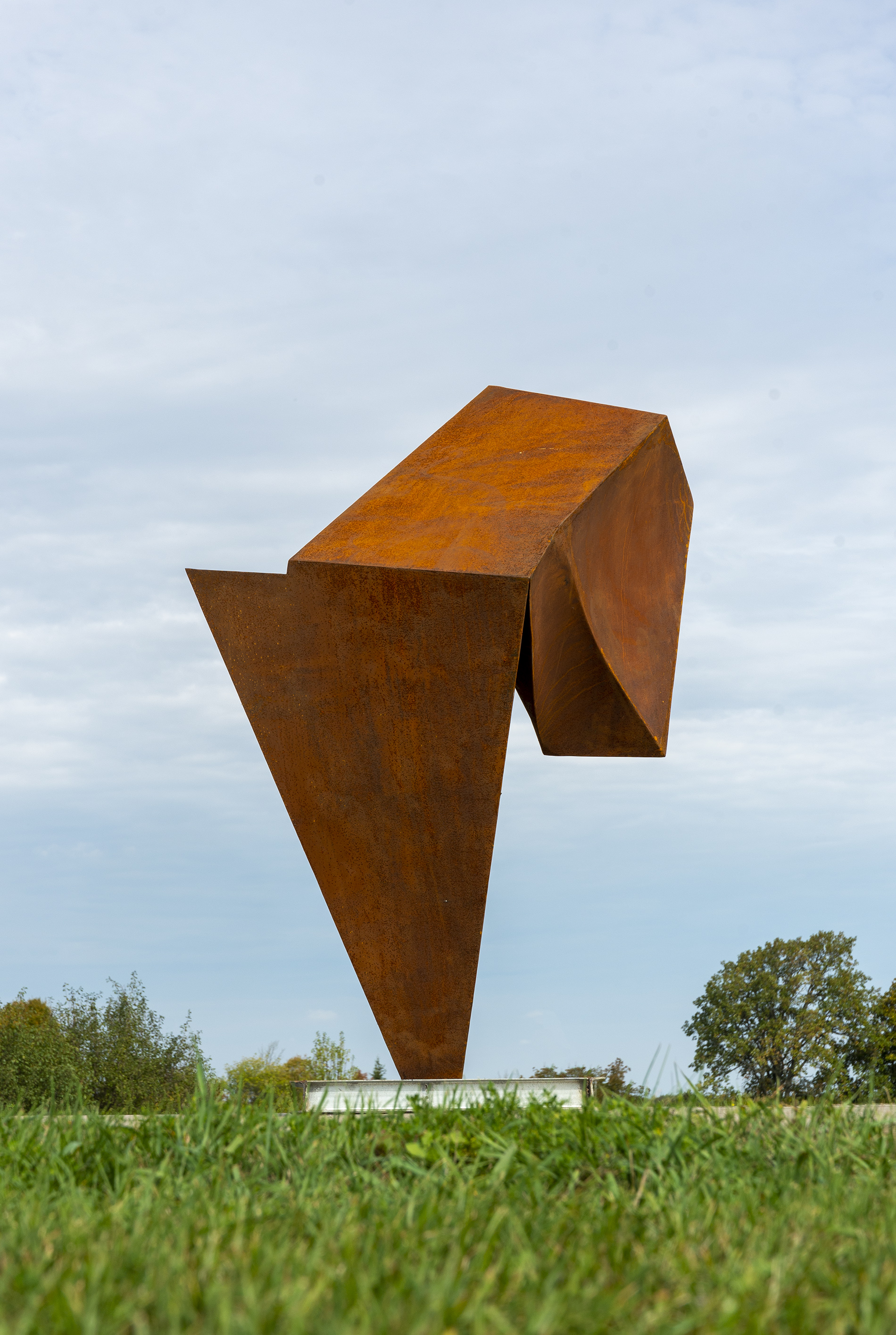 This monumental contemporary outdoor steel sculpture is by Viktor Mitic.This compelling sculpture by Viktor Mitic is named for Sirius, the brightest star in the night sky. Forged from corten steel, its rust-coloured patina accentuates its dynamic form. Angles meet fluid curves in this piece, which appear to marry both geometric and abstracted shapes. Viktor Mitic has garnered an international reputation for his provocative and imaginative contemporary artwork, including sculptures and paintings.
