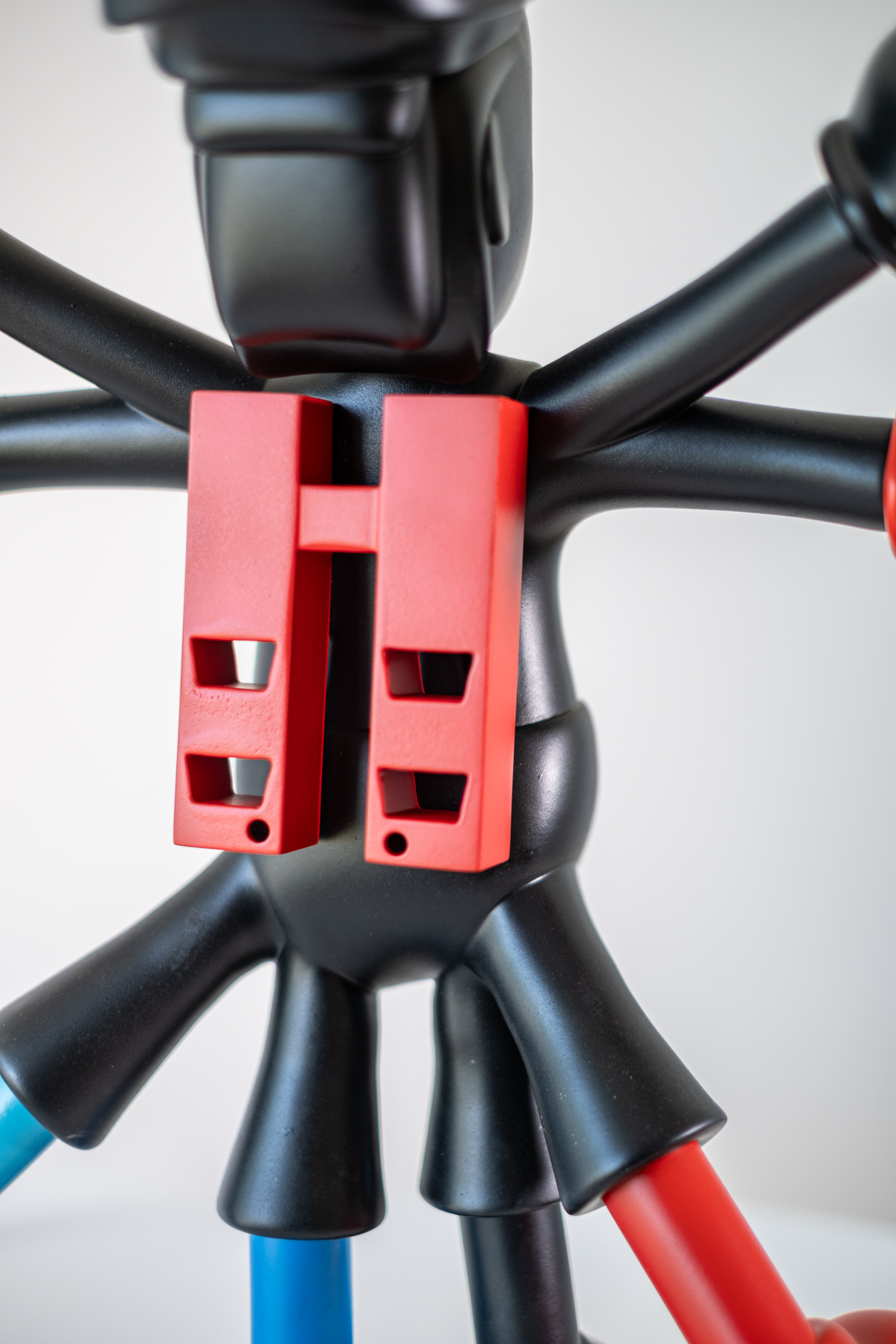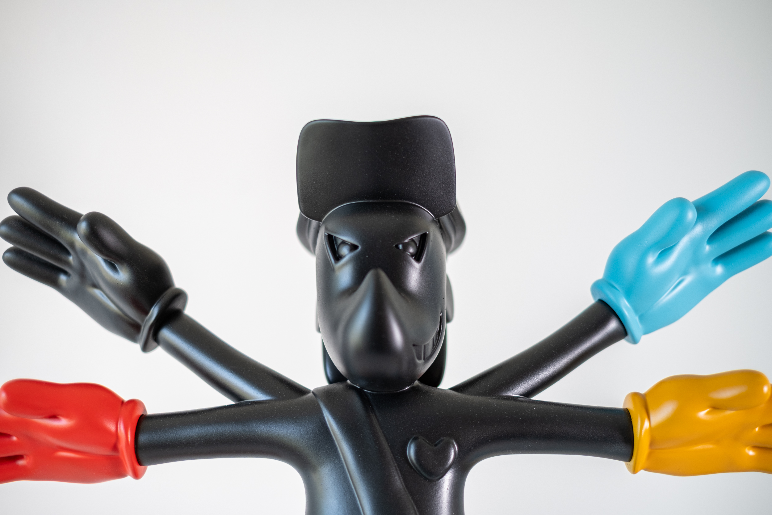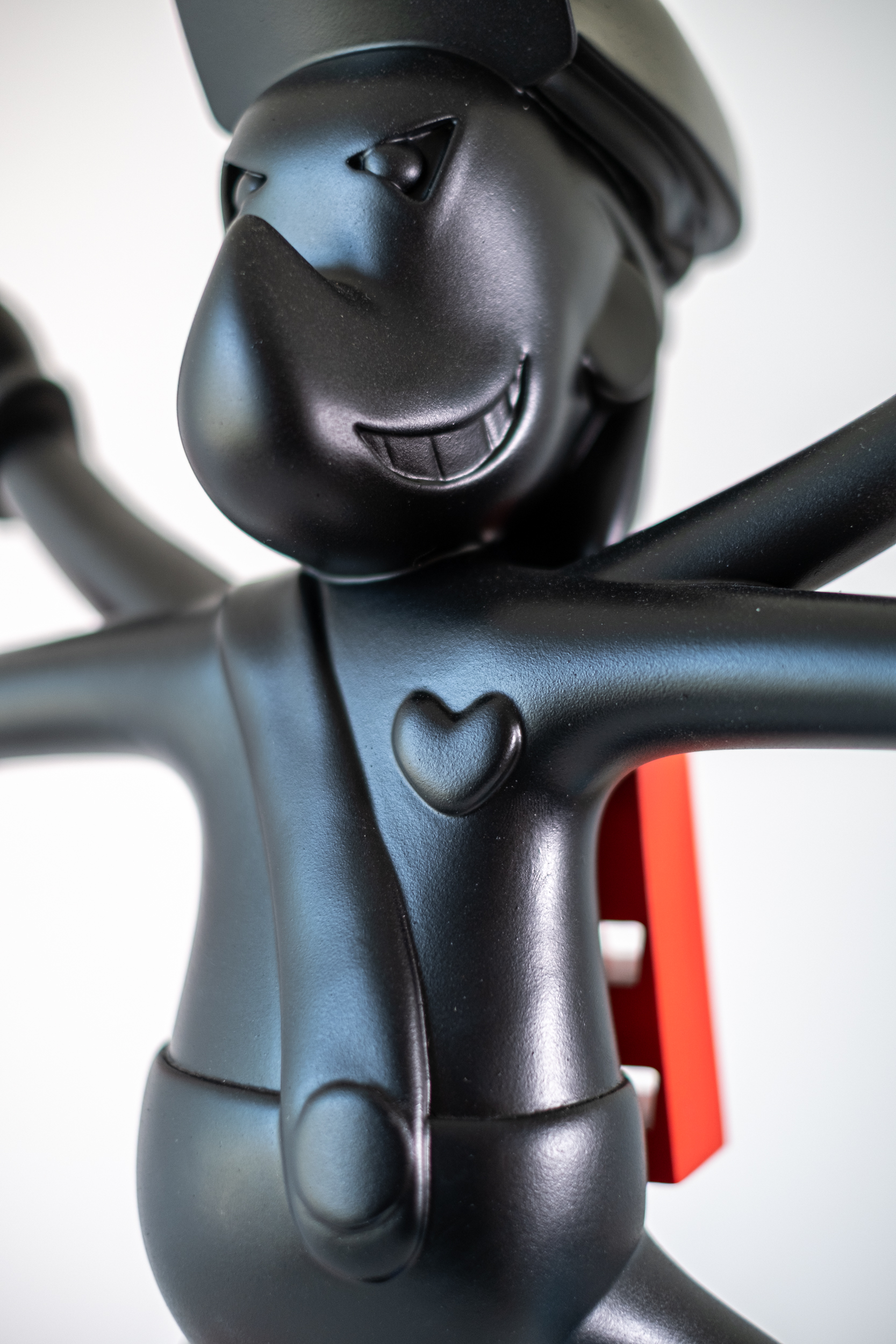 This indoor figurative pop art table top sculpture is made from resin.Playful, colourful and imaginative, Viktor Mitic’s latest series of unique sculptures appear to merge pop art with science fiction. XoX looks like an animated figure (a superhero?)--dressed in short overalls, clown-like shoes, two sets of large hands waving, upturned ball cap, bird-like face, jet pack on his back, a heart (XoX) on his chest. The colour palette is bright and contemporary—turquoise, red, blue and orange stand out against the black of the figure. These 3-D figures began as digital creations, sculpted out of resin and hand painted.