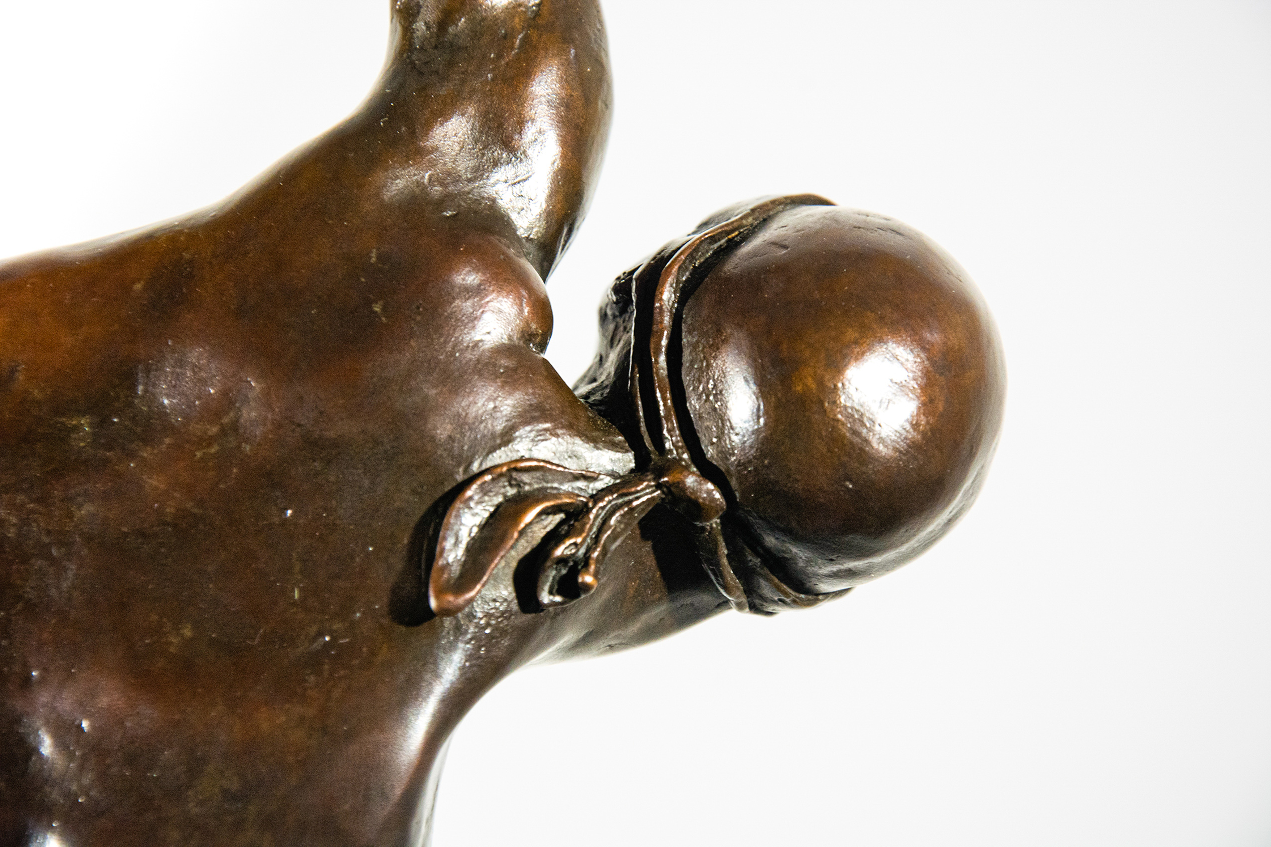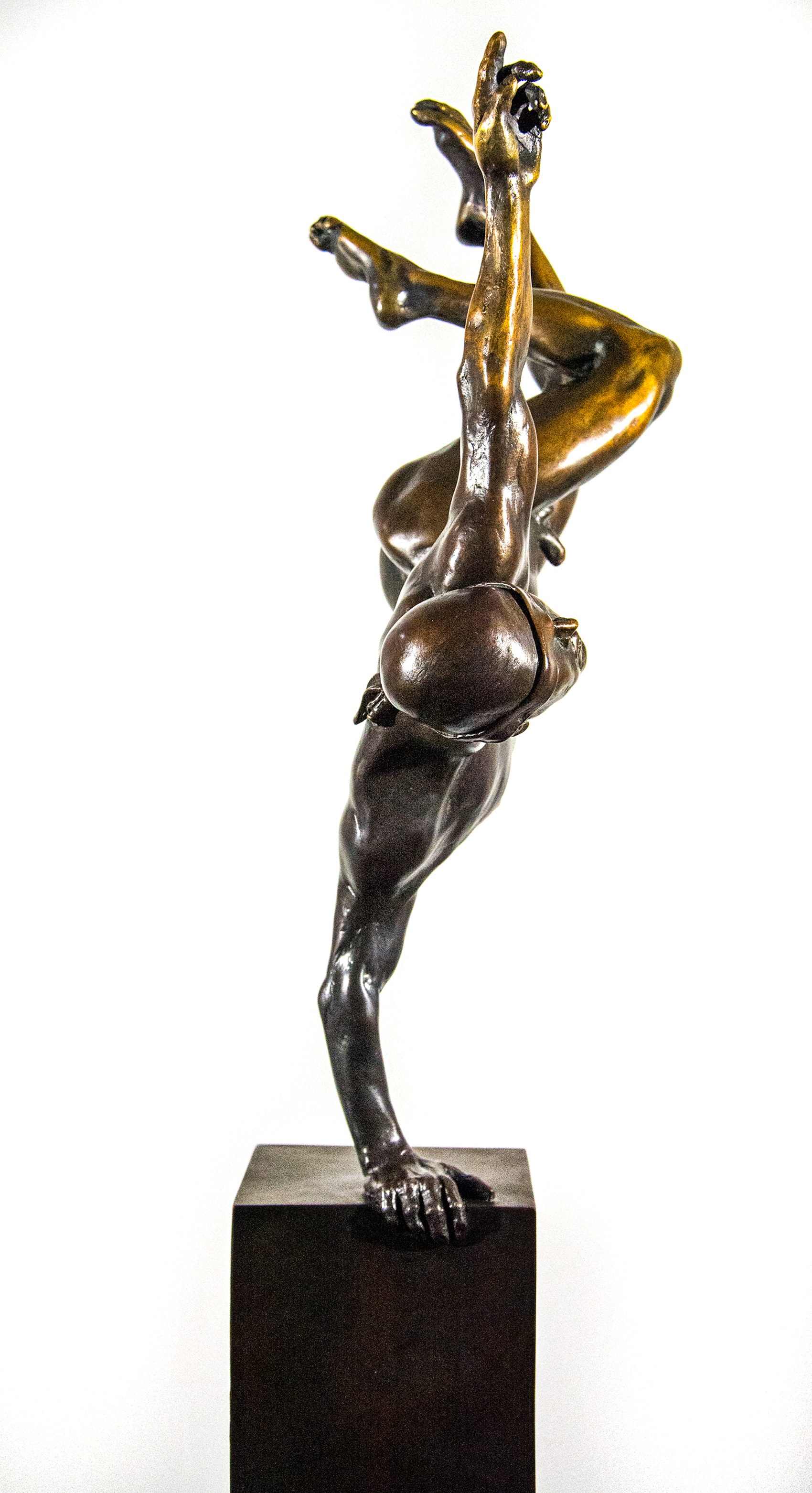 At once expressive and elegant, William Hung creates dynamic sculptures that explore the human condition. With this intimate piece, cast in a rich bronze, an athlete balances on one hand, his nude, fit body appearing to be suspended in mid-air. The raw, powerful athleticism of the gymnast is what captures our attention at first glance. Only later do we realize the figure is blindfolded and doubly vulnerable. The Canadian artist’s work honours traditional figurative sculpture with a contemporary aesthetic.Available on commission, please allow 6 - 8 weeks before delivery. $700 additional for white base. This work may be exhibited on a tabletop. The sculpture may also be placed on a tall steel pedestal, custom ordered, as viewed here, for an additional cost of $700. plus shipping. The bronze is number 3 in an edition of 9.