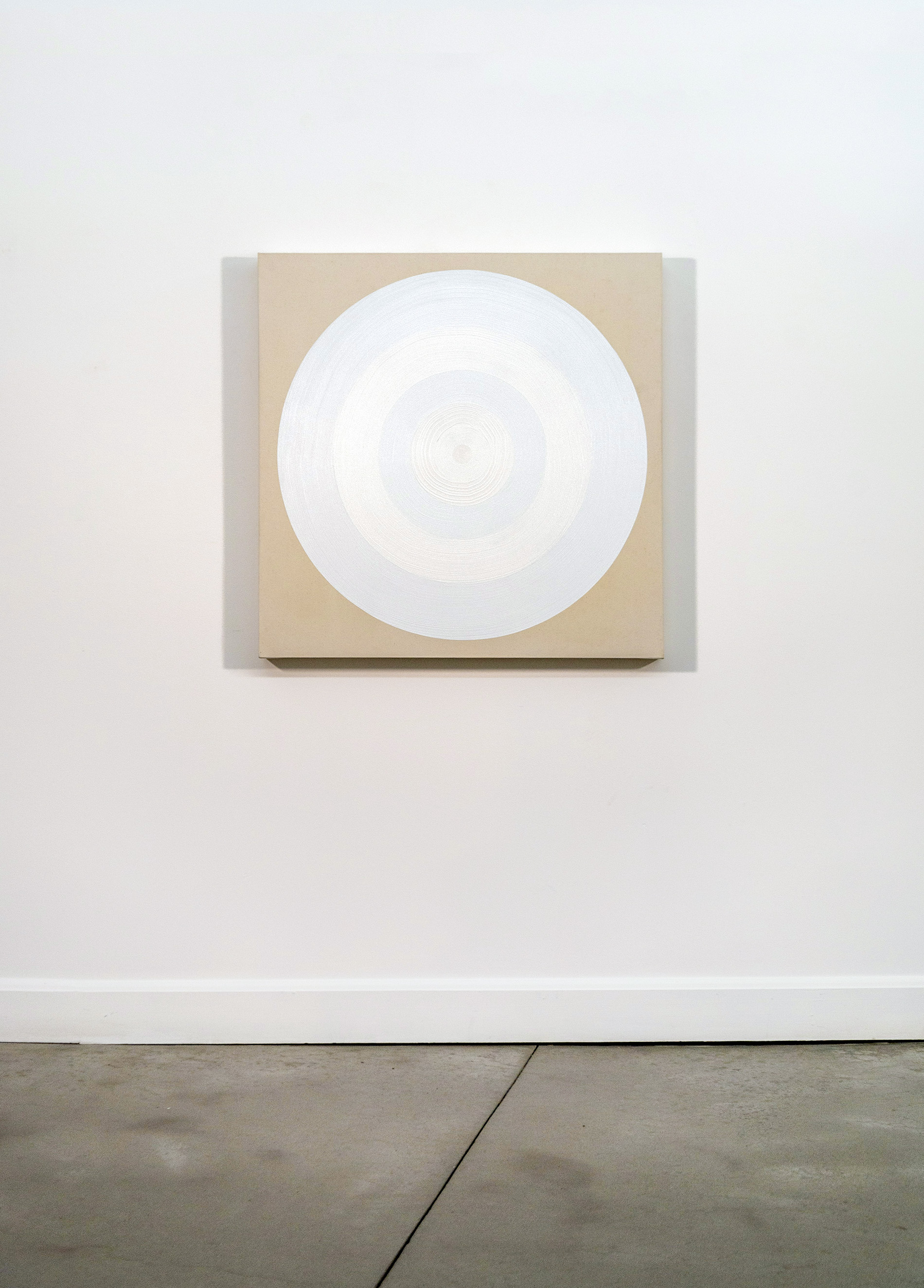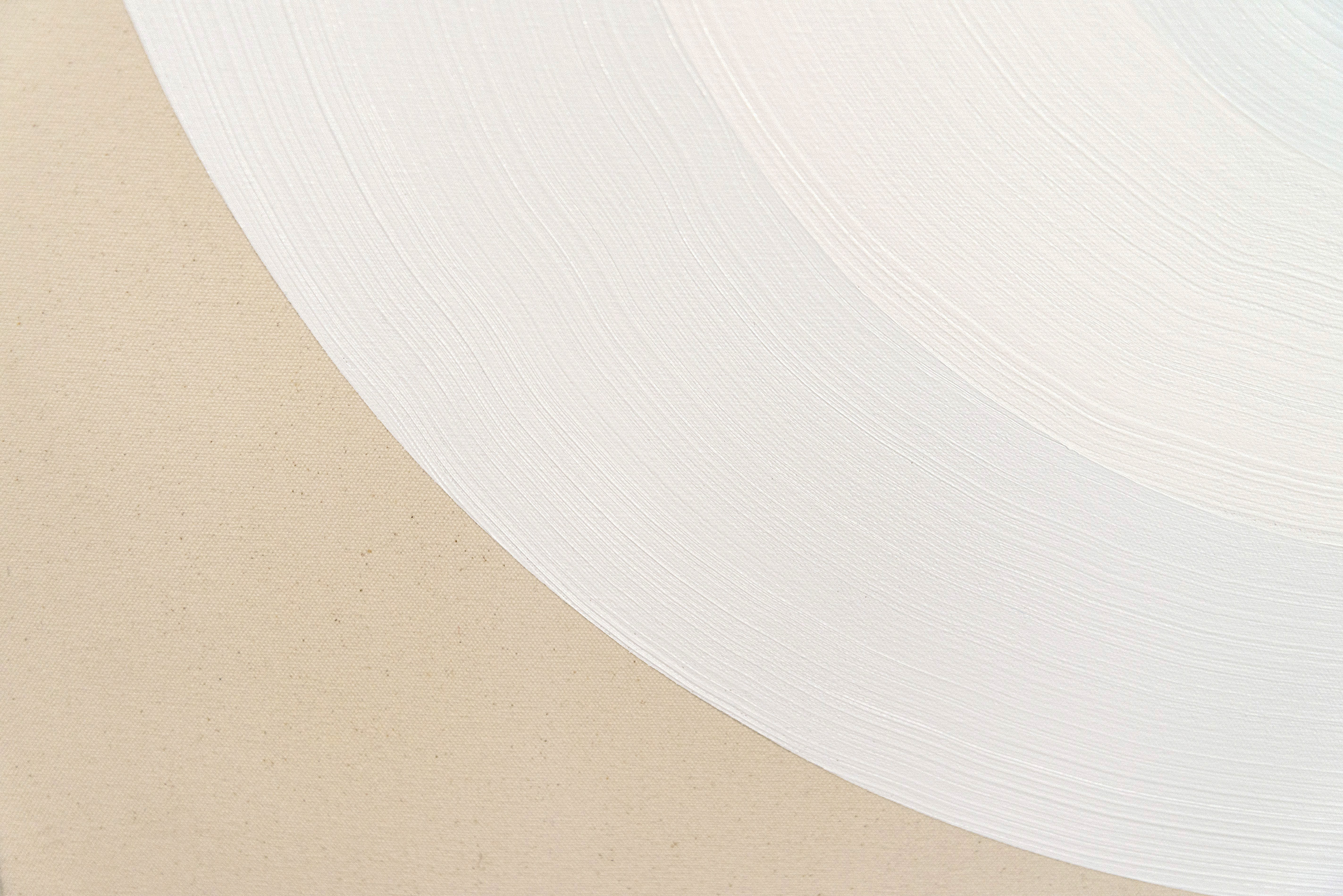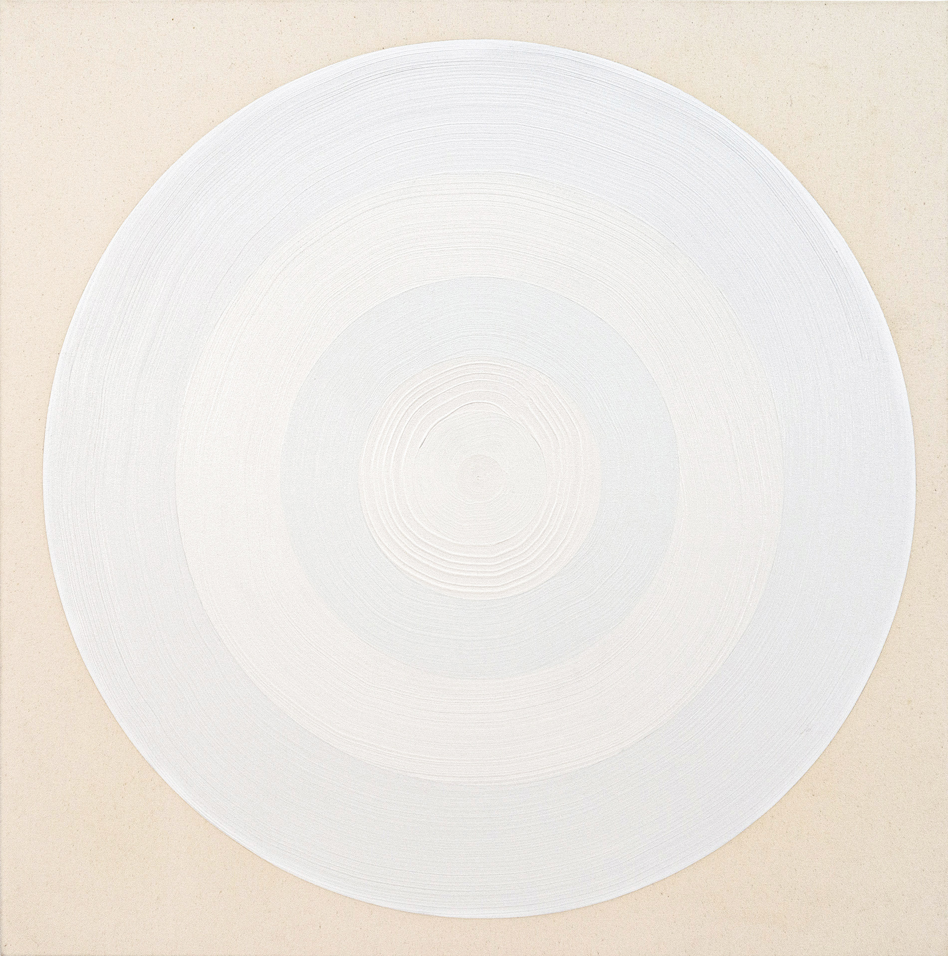 This dynamic contemporary circular painting in bright white is by Yvonne Lammerich. The Canadian artist has been exhibiting her uniquely bold work both nationally and internationally for decades. Lammerich is known for her provocative experimental work that often plays with the viewer’s perception. What is real and what is illusion? A close examination of this work reveals circles within circles emanating from a defined target. One of a limited series.“The circular target is not just an arbitrary visual model for a focal point of arrival but is itself inscribed by the primary actions of the body in its fullest extension on a surface.” Yvonne Lammerich
