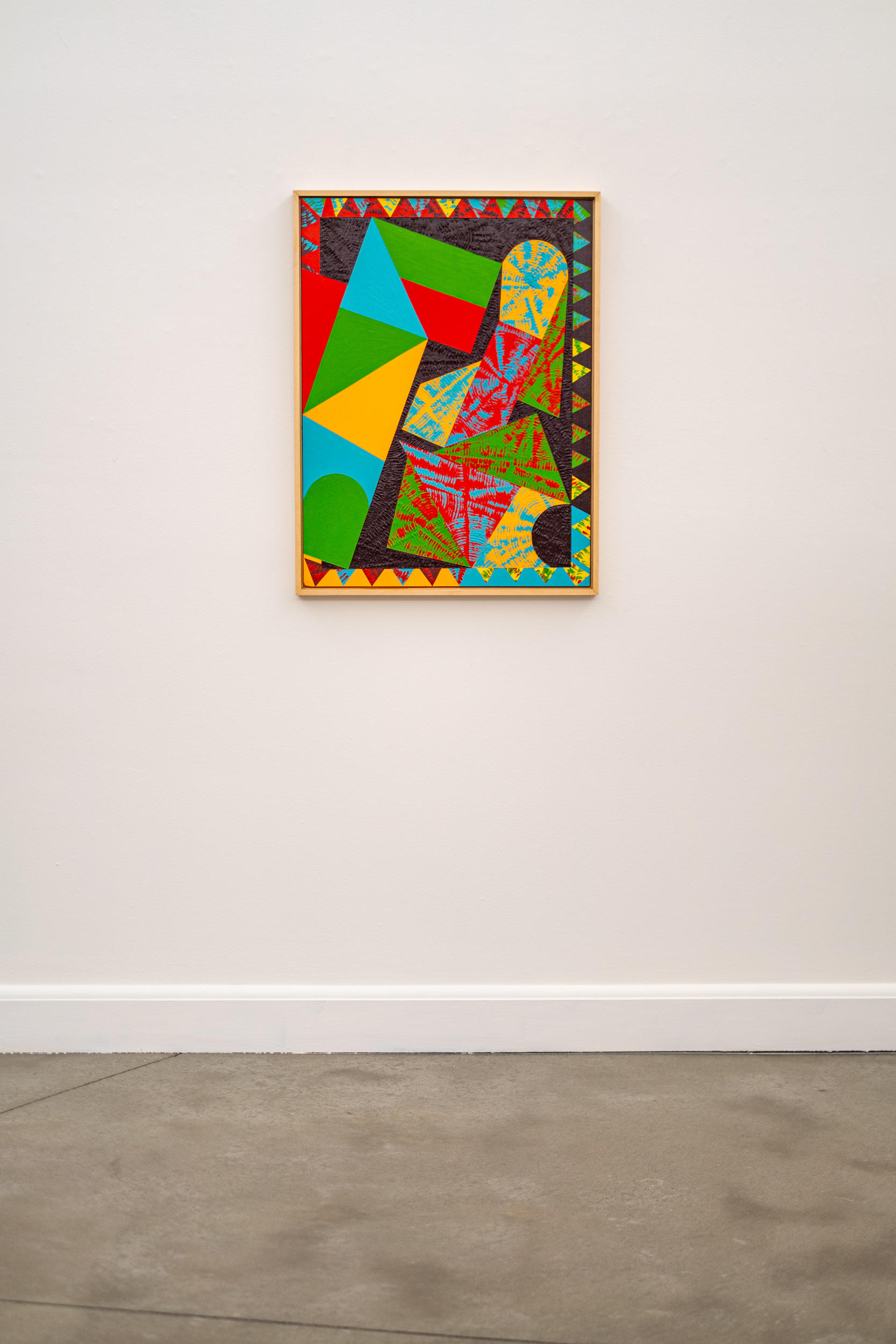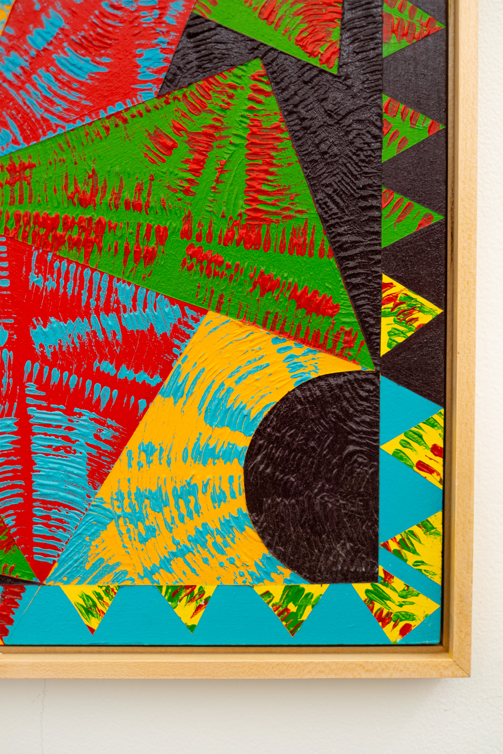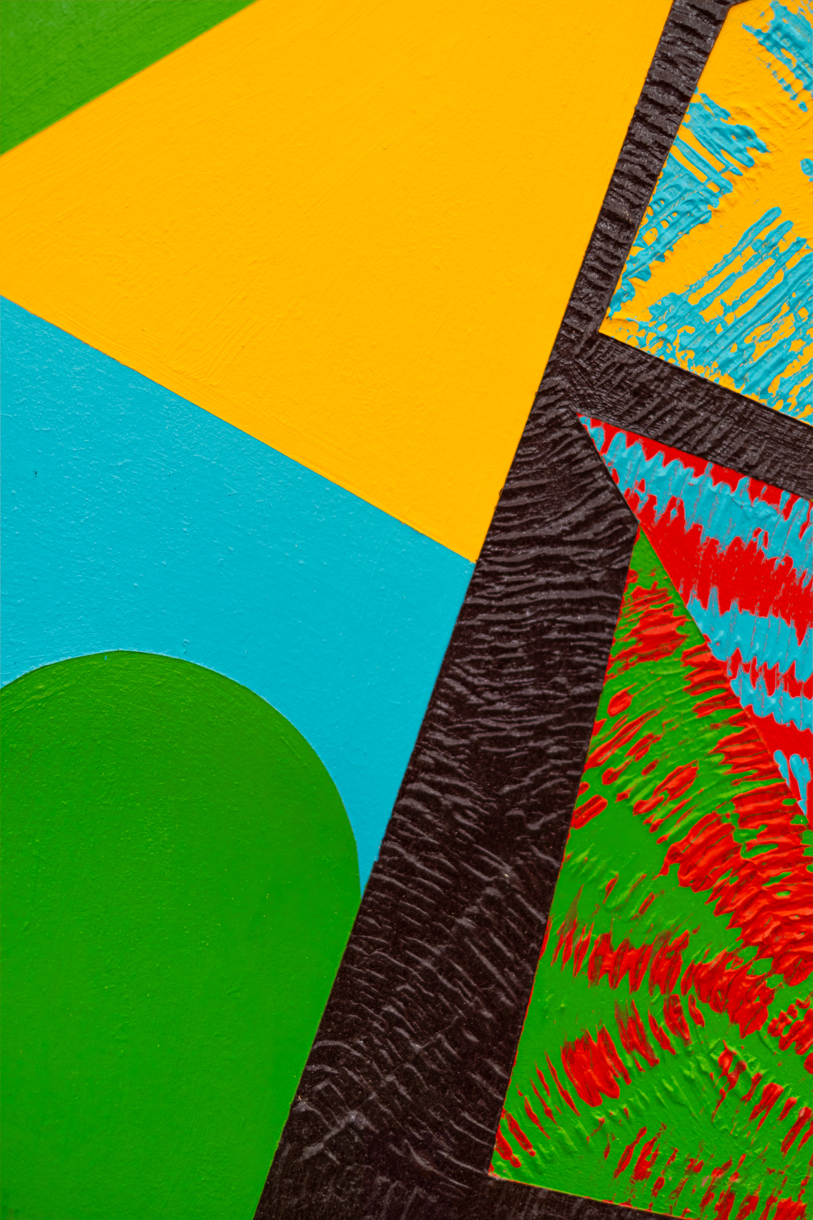 This contemporary abstract painting features colourful geometric patterns.For several decades, the dynamic acrylic paintings of Yvonne Lammerich have attracted the attention of both critics and art collectors internationally. This series of abstract paintings called ‘Current’ explores shape and vivid colour— expressed in bold geometric patterns that appear to have palpable energy. Lines, squares, circles, and triangles In bright red, turquoise, green, orange and yellow pop against a backdrop of jet black. One of a series that when grouped together make a powerful statement.