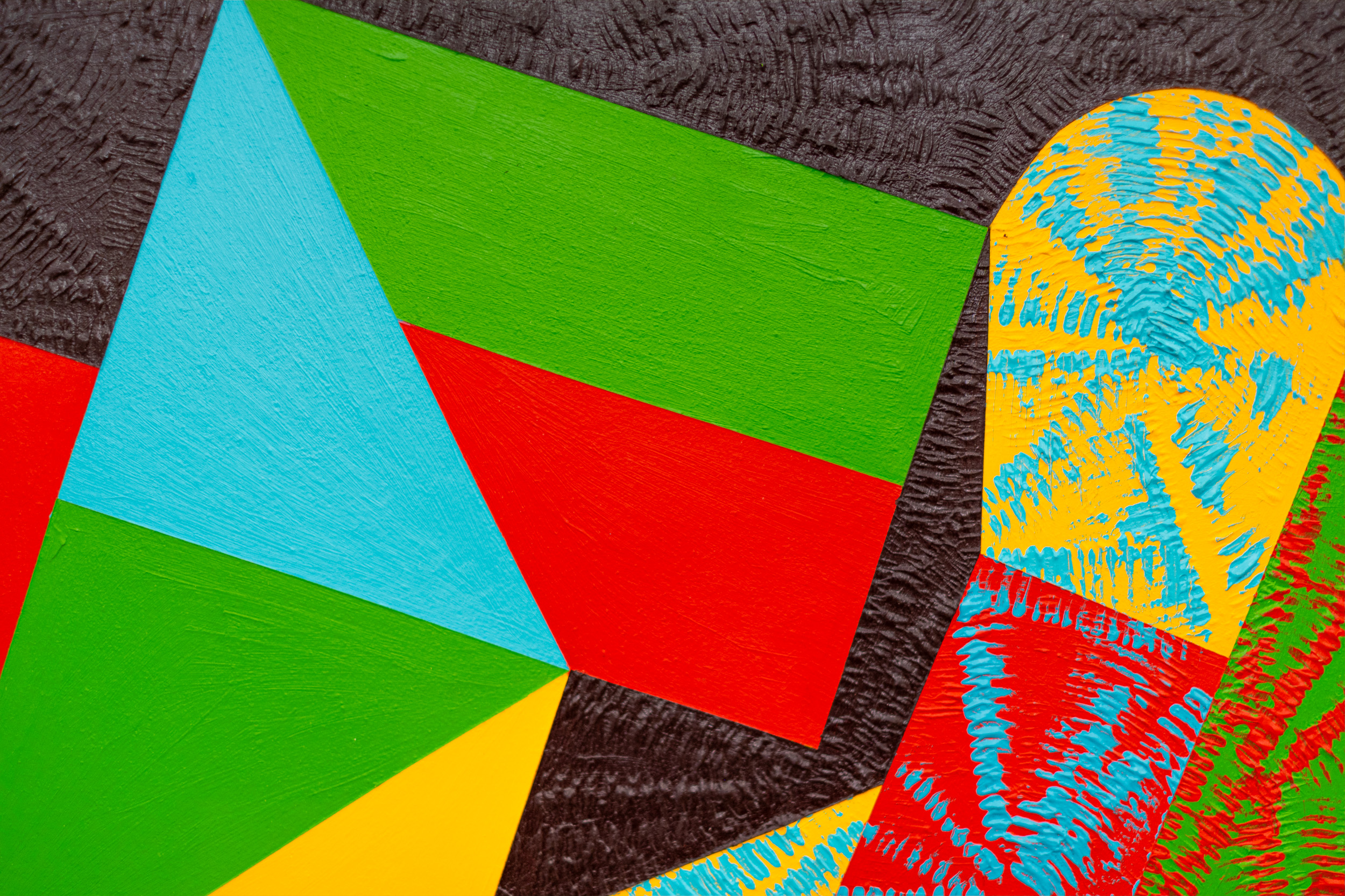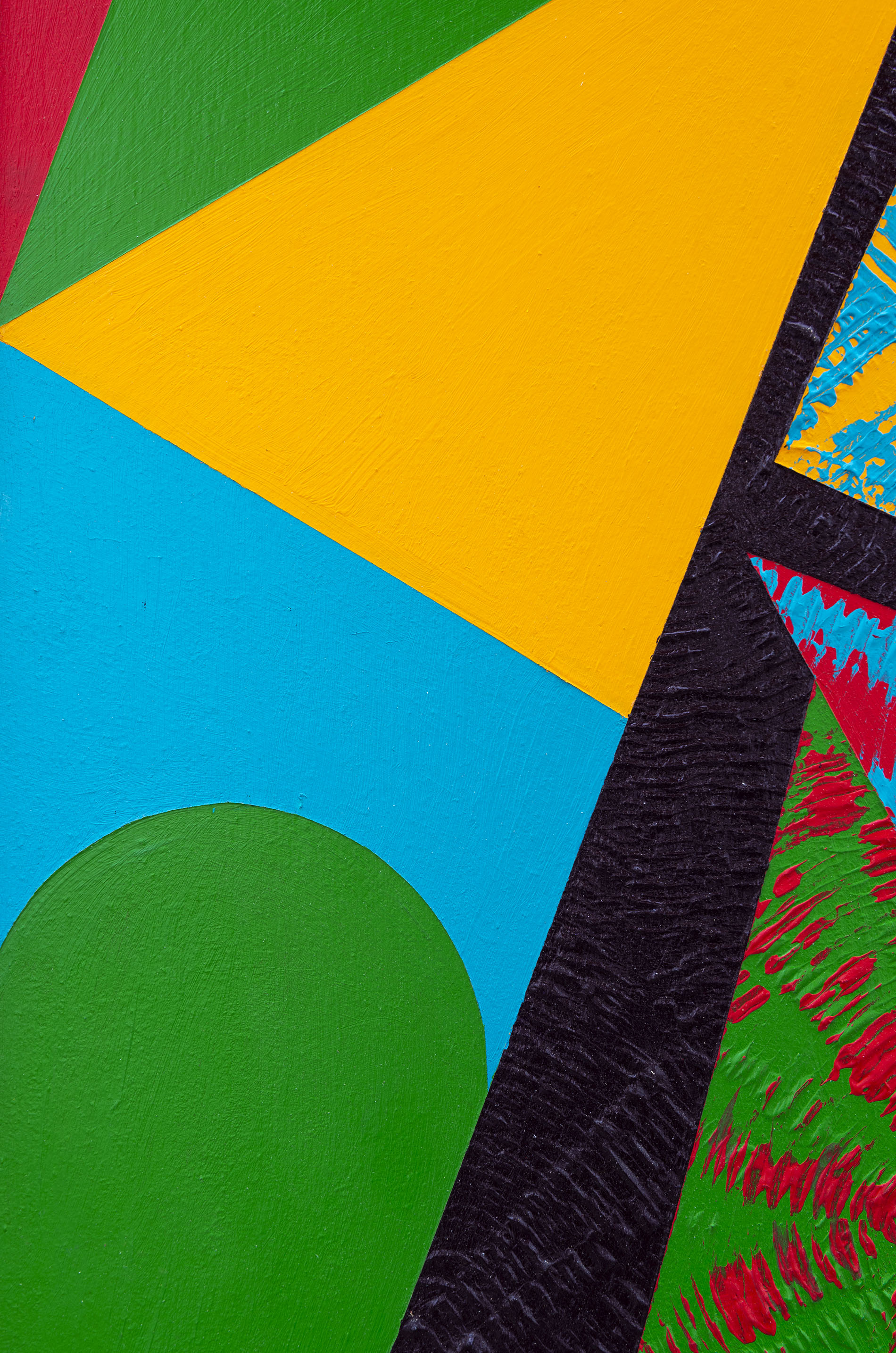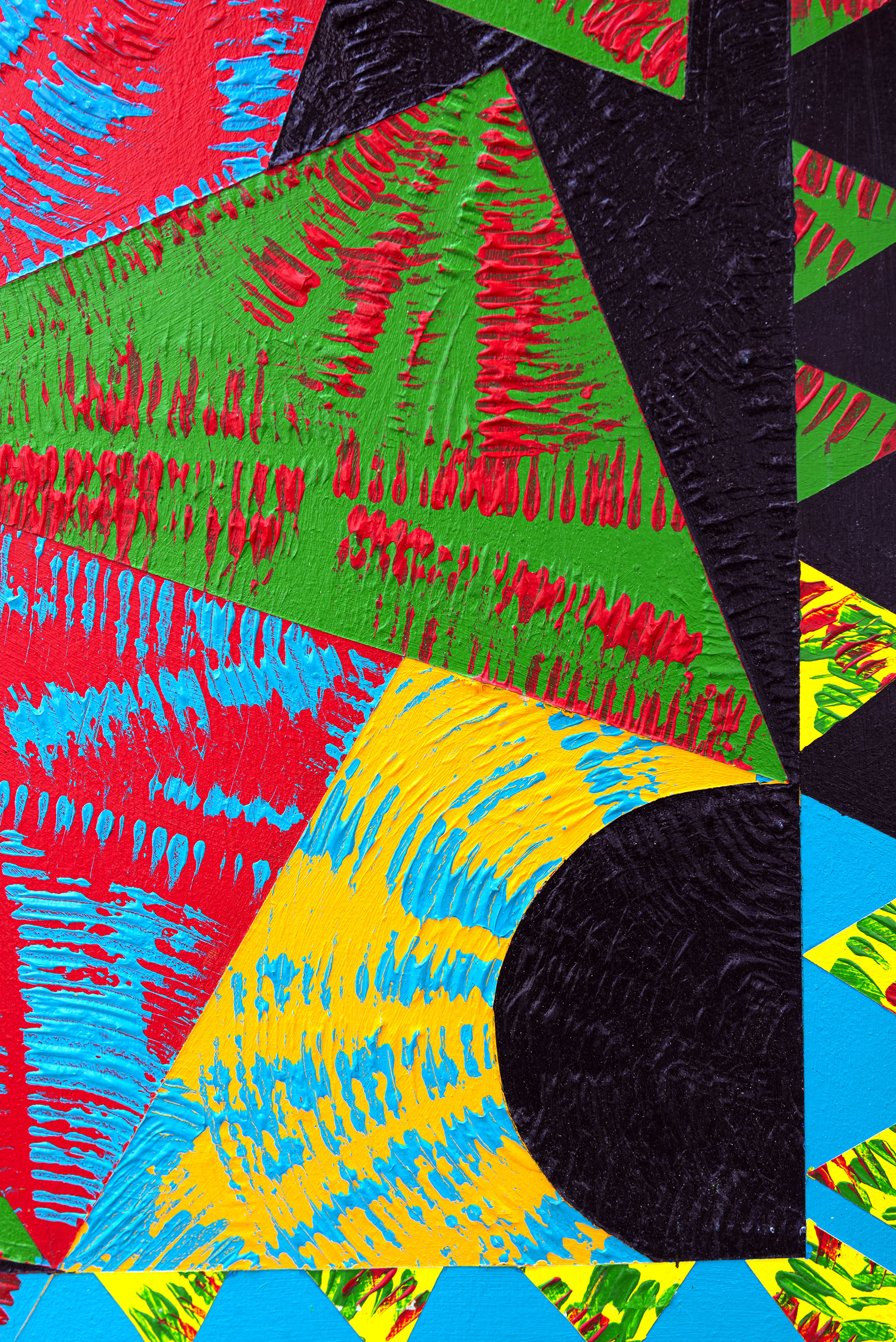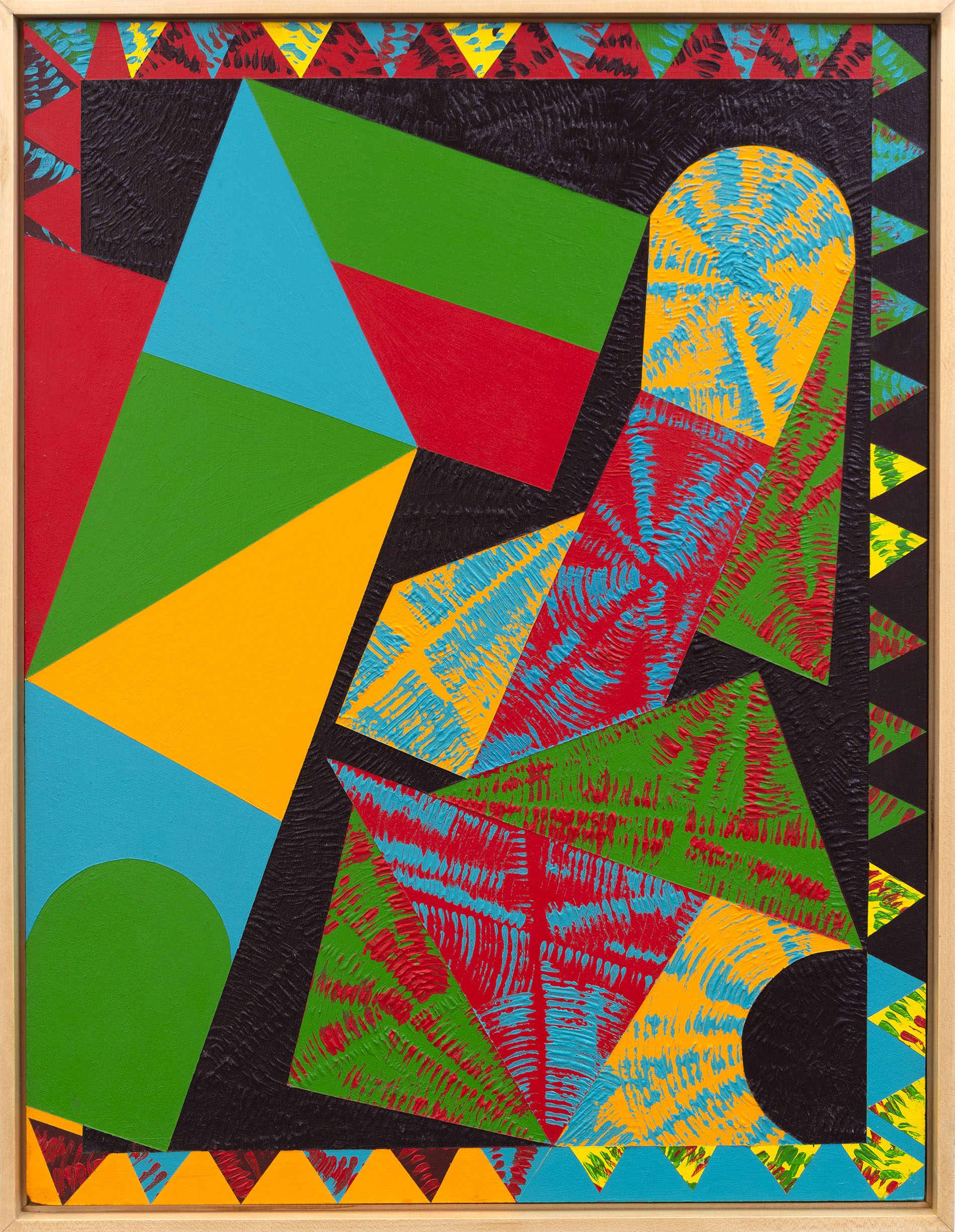 This contemporary abstract painting features colourful geometric patterns.For several decades, the dynamic acrylic paintings of Yvonne Lammerich have attracted the attention of both critics and art collectors internationally. This series of abstract paintings called ‘Current’ explores shape and vivid colour— expressed in bold geometric patterns that appear to have palpable energy. Lines, squares, circles, and triangles In bright red, turquoise, green, orange and yellow pop against a backdrop of jet black. One of a series that when grouped together make a powerful statement.